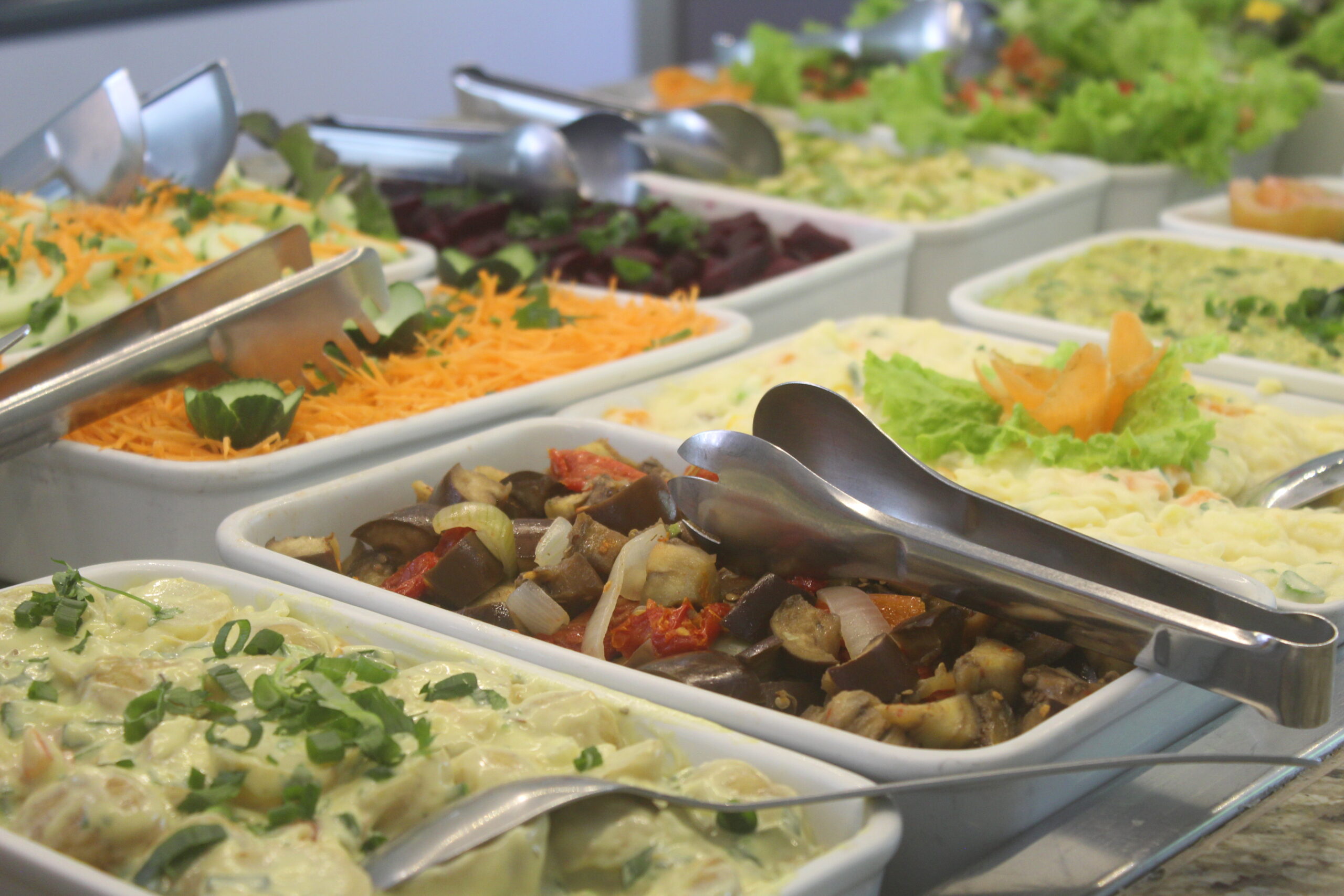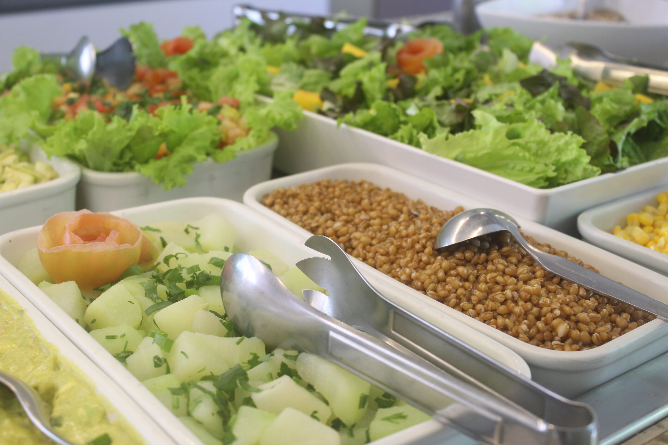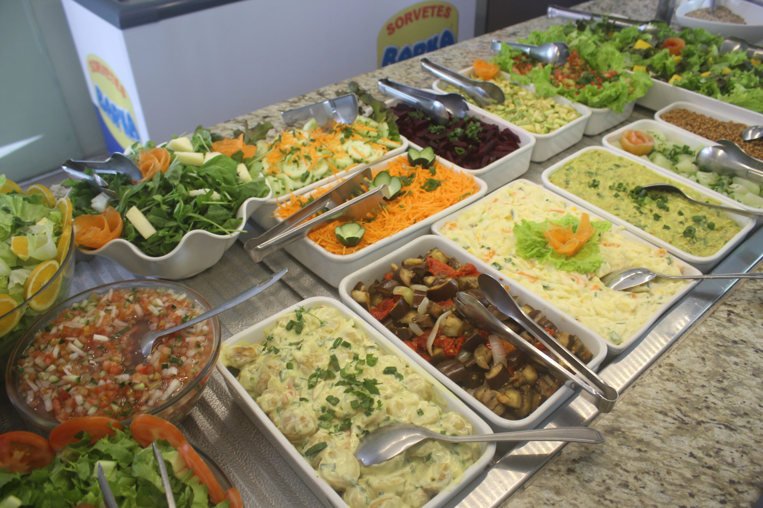 Buffet com proteína de soja e ingredientes frescos.